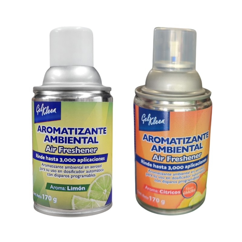 Mantén tus espacios siempre frescos con el Repuesto de Aroma en Aerosol Gel Kleen 170 g, disponible en fragancias de Limón y Cítricos. Especialmente formulado para su uso con el dosificador automático Gel Kleen, libera disparos programables que garantizan un ambiente agradable y constante durante todo el día.